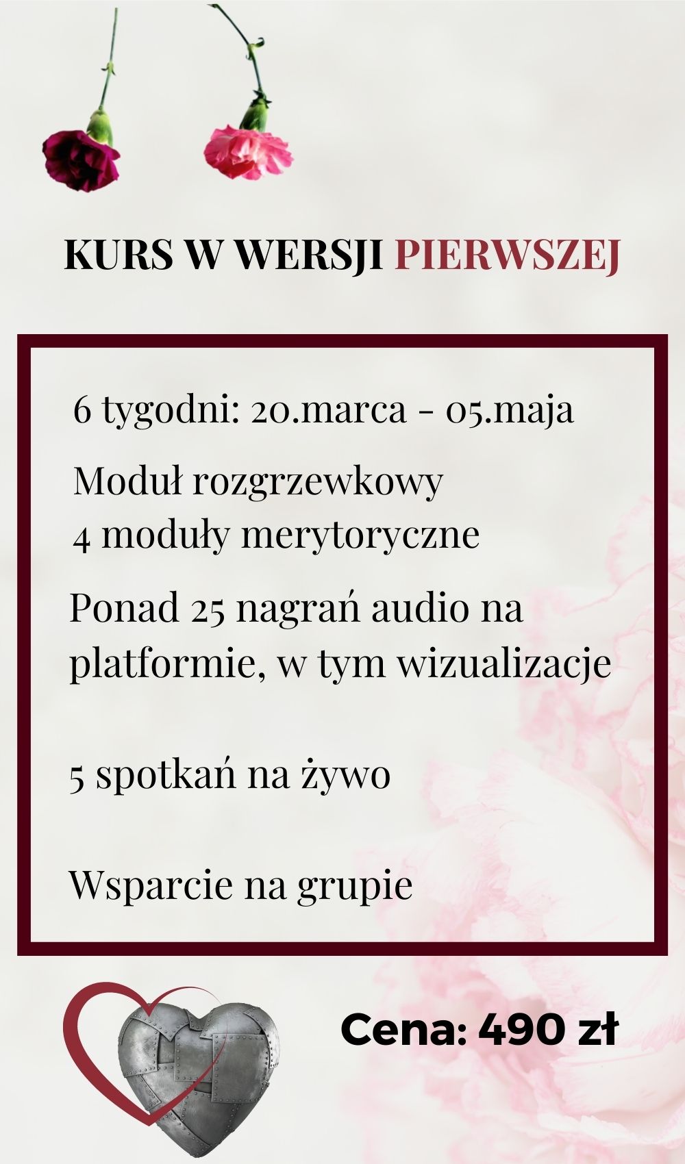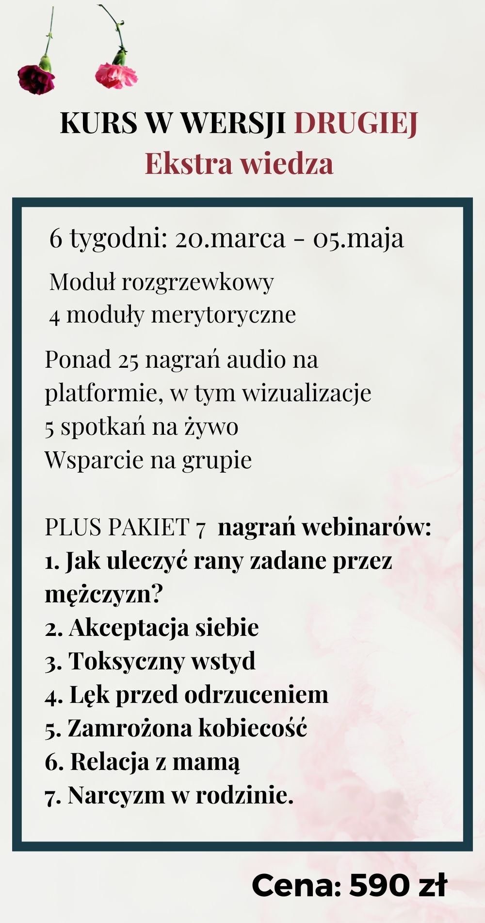 Kurs nie zastępuje profesjonalnej indywidualnej opieki terapeutycznej czy lekarskiej. Biorąc udział w nim akceptujesz to, że mogą pojawić się w Tobie różne emocje i bierzesz pełną odpowiedzialność za to, czego doświadczasz. W razie wątpliwości możesz napisać do mnie. Przeciwwskazaniem do udziału w warsztacie jest leczenie farmakologiczne i ciąża.