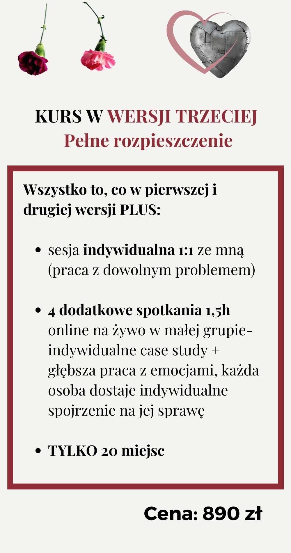 Kurs jest w cenie trzech sesji w gabinecie, a wiem, że doświadczeń, wiedzy i procesów będzie na nim jak na co najmniej 20 sesjach. I mówię to z ręką na sercu. Nie ma na rynku kursu z taką opieką prowadzącej w tej cenie. To druga edycja i kursantki z pierwszej mówiły, że odkryły więcej, niż przez wiele miesięcy terapii.